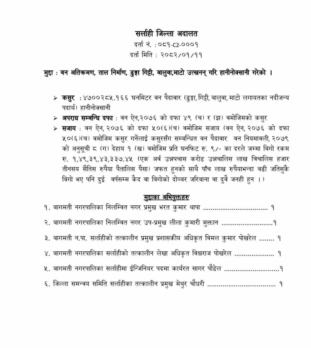बागमती नगरपालिकाका निलम्बित नगर प्रमुख भरत थापा, उपप्रमुख लीला कुमारी मुक्तान, तत्कालीन प्रमुख प्रशासकीय अधिकृत विमलकुमार पोखरेल, तत्कालीन लेखा अधिकृत विश्वराज पोखरेल, इन्जिनियर सागर पौडेल र जिल्ला समन्वय समिति सर्लाहीका तत्कालीन प्रमुख मेथुर चौधरीमाथि मुद्दा दाएर भएको थियो।