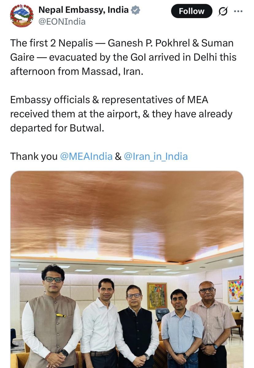 नयाँदिल्लीस्थित नेपाली दूतावासले गणेशप्रसाद पोखरेल र सुमन गैरेलाई भारत सरकारले इरानबाट उद्धारबाट ल्याएको जनाएको छ । उनीहरू बुटवलतर्फ लागिसकेको नेपाली दूतावासले जनाएको छ ।