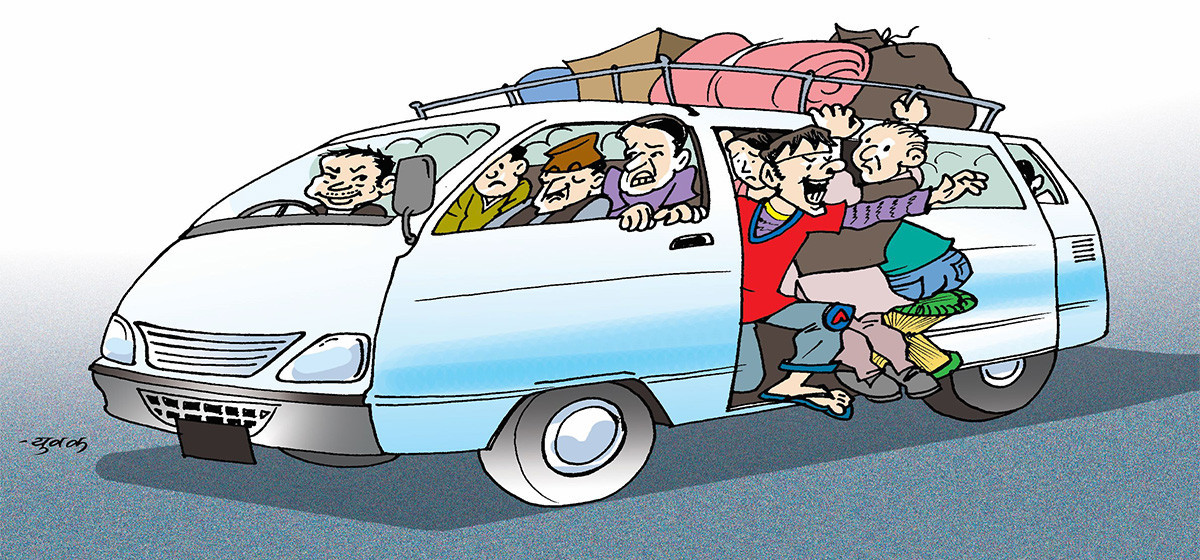 चालक–सहचालक आउनूस् आउनूस् भनेर यात्रुलाई डाकिरहेका हुन्छन्। चढेका यात्रुको गुनासो हुन्छ, ‘हत्तेरी ! सिट छैन, ढोकामै अड्किनुपर्छ। गाडी ढिलो, तैपनि ओभरलोड।’