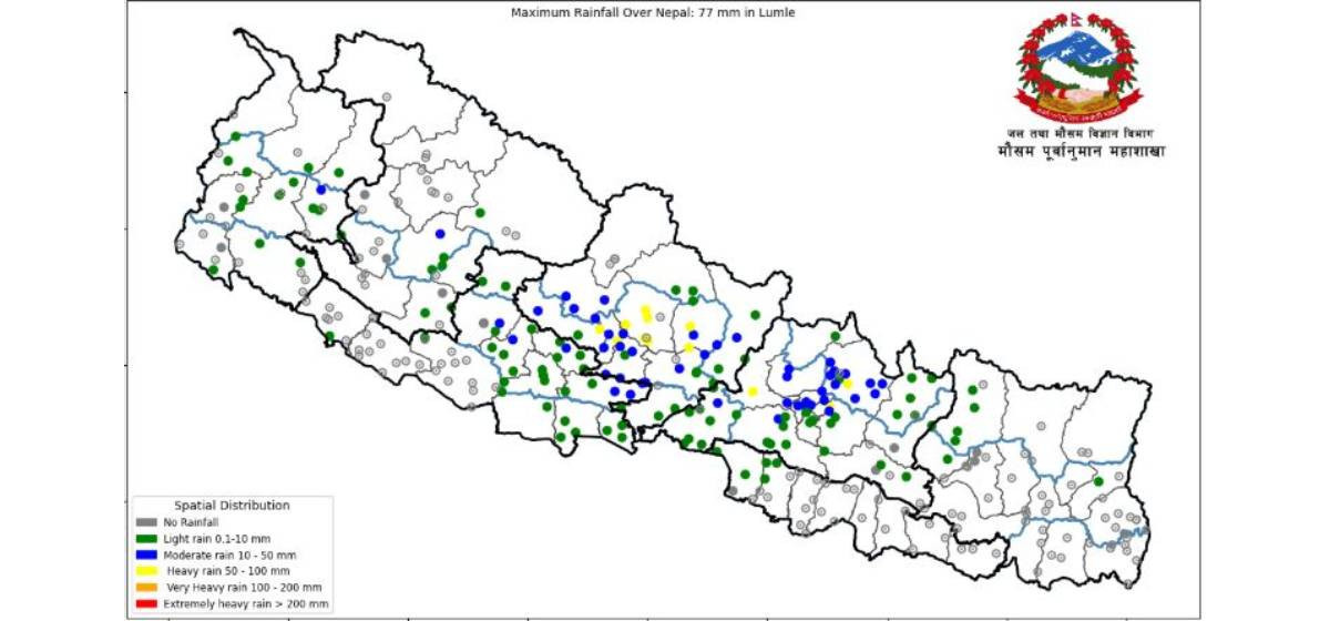 दिउँसो सुदूरपश्चिम, कोशी, बागमती, गण्डकी, लुम्बिनी र कर्णाली प्रदेशका केही स्थानमा मेघगर्जन र चट्याङसहित हल्का देखि मध्यम वर्षाको सम्भावना छ। कर्णाली, सुदूरपश्चिम र गण्डकी प्रदेशका एक–दुई स्थानमा भारी देखि धेरै भारी वर्षा हुने अनुमान छ।