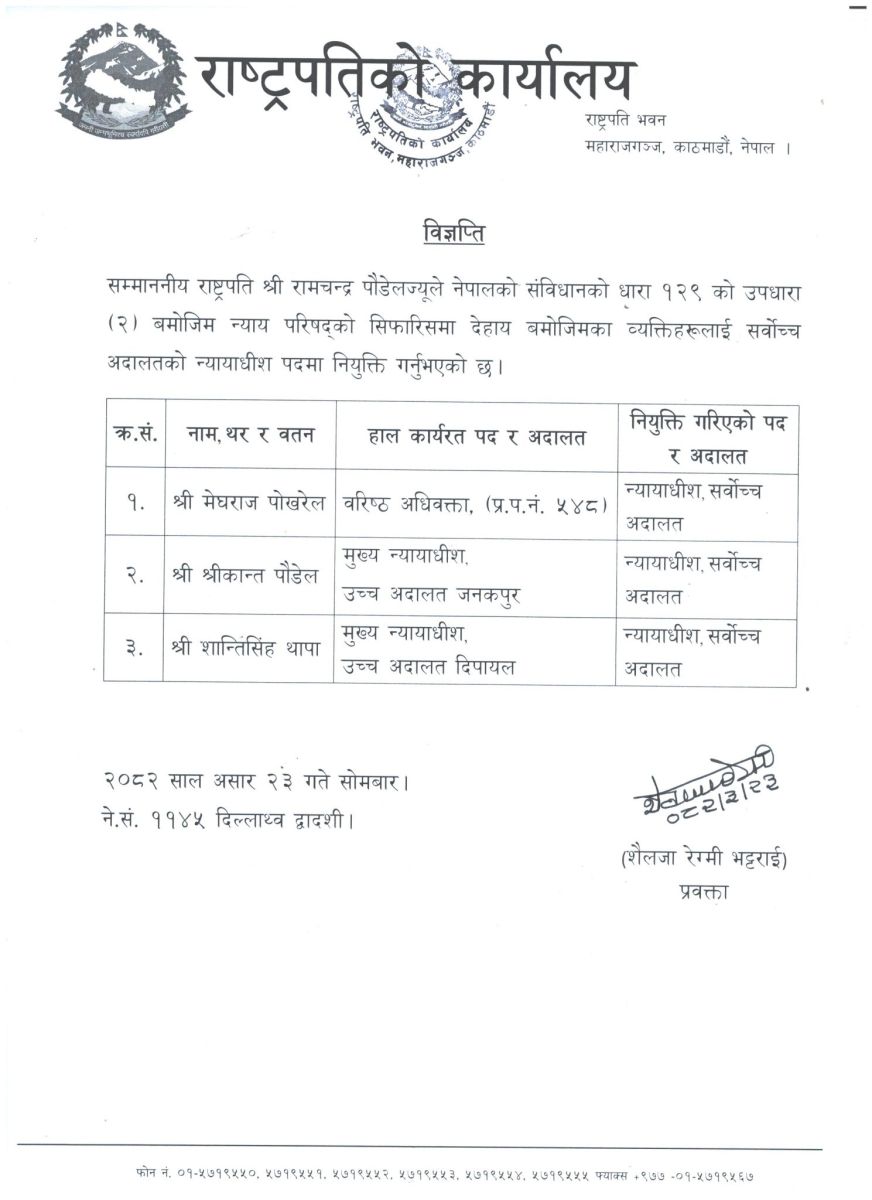 न्याय परिषद्को सिफारिस बमोजिम राष्ट्रपति रामचन्द्र पौडेलले मेघराज पोखरेल, श्रीकान्त पौडेल र शान्तिसिंह थापालाई नियुक्त गरेको शीतल निवासले जनाएको छ ।