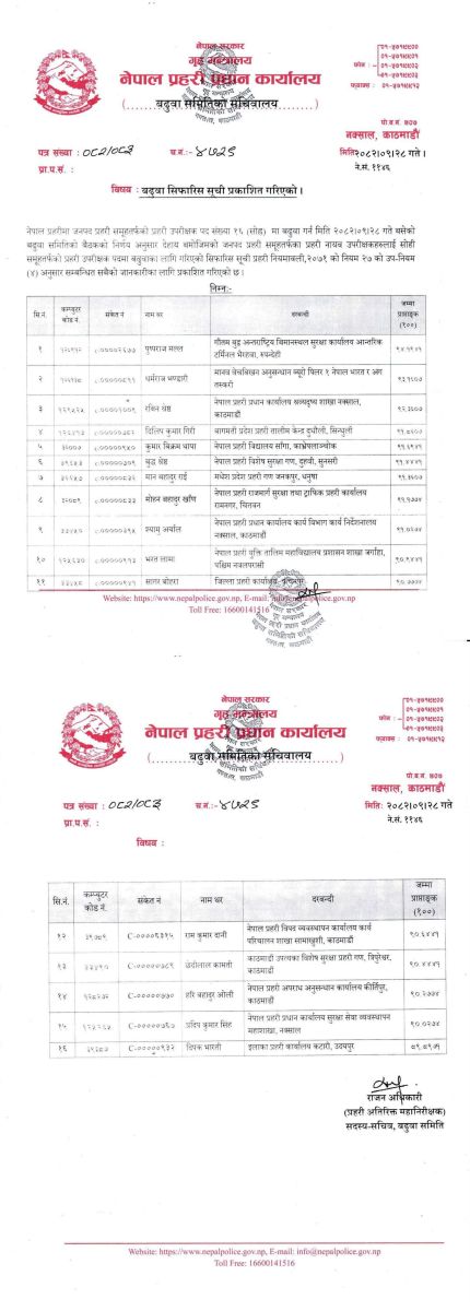 आजको बढुवा समितिको बैठकले नेपाल प्रहरीको जनपद प्रहरी समूहतर्फका १६ जना प्रहरी नायव उपरीक्षकलाई प्रहरी उपरीक्षकमा बढुवाको सिफारिस गरेको हो ।