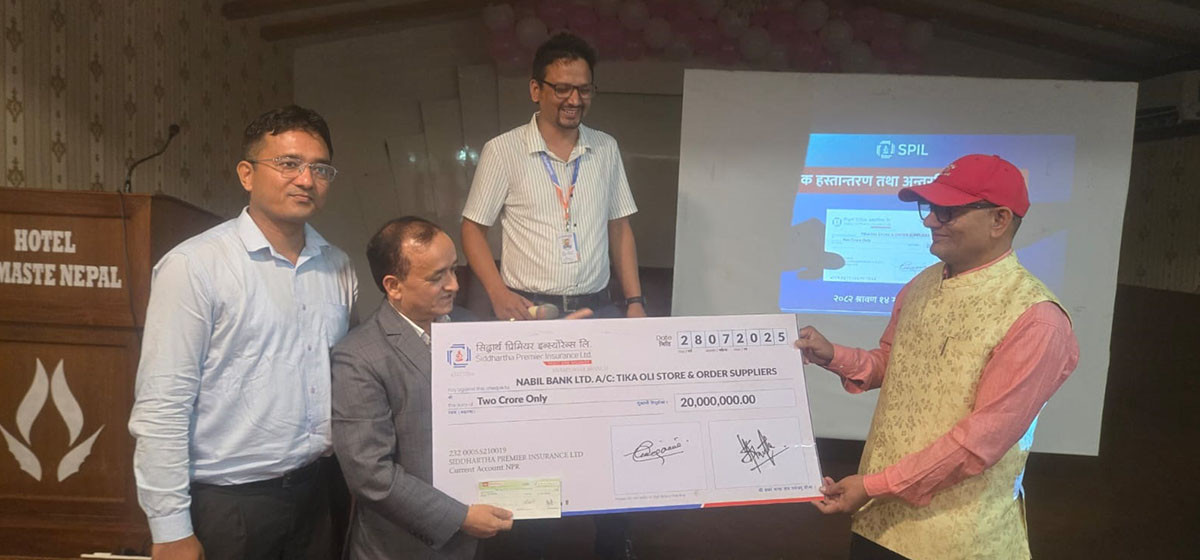गत वैशाख २५ गते भएको आगलागीबाट व्यवसायमा ठुलो क्षति पुगेपछि कम्पनीले बीमित पक्षलाई दाबी रकम चाँडै उपलब्ध गराएको हो। सो दाबी रकमको चेक सिद्धार्थ प्रिमियर इन्सुरेन्स लिमिटेडका सहायक महाप्रबन्धक तथा दाबी विभाग प्रमुख नवराज पराजुलीले एक कार्यक्रमका बिच हस्तान्तरण गरेका हुन्।