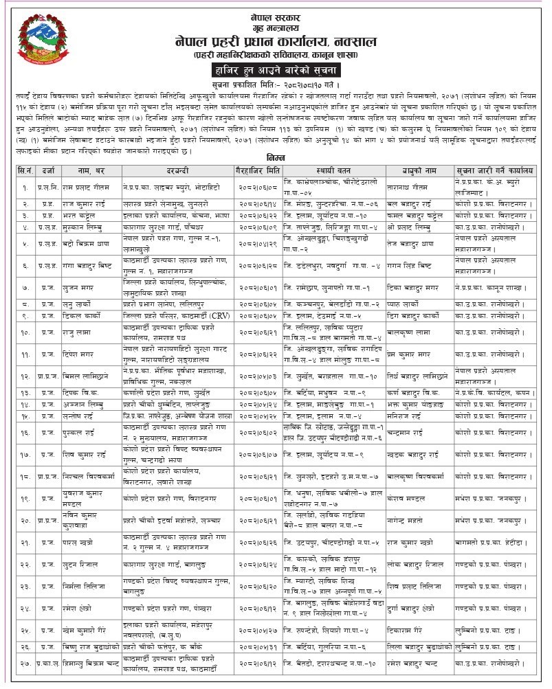 प्रहरी प्रधान कार्यालयले नआए प्रहरी नियमावलीअनुसार सेवाबाट बर्खास्त गरिने चेतावनी दिइएको छ। यो सूचना प्रकाशित भएसँगै दर्जनौँ प्रहरी कर्मचारीको जागिर खतरामा परेको छ।