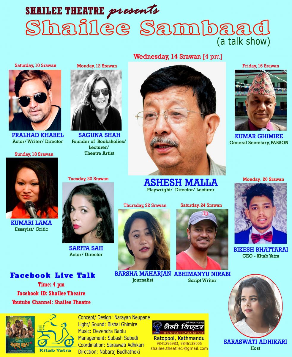 शैली थिएटरका व्यवस्थापक सुबास सुबेदीकाअनुसार साउन १४ गते नाटककार अषेश मल्ल, १६ गते प्यापसन महासचिव कुमार घिमिरे, १८ गते आइतबार समिक्षक र निबन्धकार कुमारी लामा, २० गते मंगलबार निर्देशक तथा कलाकार रिता शाह, २२ गते बिहीबार कला पत्रकार वर्षा महर्जन, २४ गते शनिबार लेखक अभिमन्यु निरवी र २६ गते सोमबार ’किताब यात्राका’ प्रबन्ध निर्देशक बिकेश भट्टराई अतिथि रहेछन् ।
