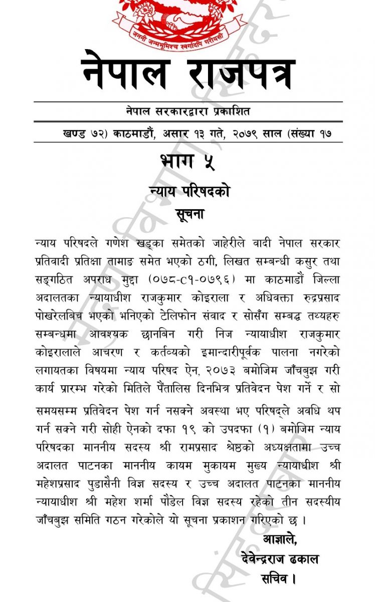 छानबिन समिति गठन बारेको सूचना सोमबार राजपत्रमा प्रकाशित एको थियो। राजपत्रमा प्रकाशित सूचनामा न्यायाधीश कोइराला र अधिवक्ता पोखरेलबीच भएको भनिएको टेलिफोन संवाद र सोसँग सम्बद्ध तथ्यहरु सम्बन्धमा तथा कोइरालाले आचरण र कर्तव्यको इमान्दारीपूर्वक पालना नगरेको लगायतका विषयमा छानबिन गर्न समिति बनाइएको उल्लेख गरिएको छ।