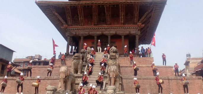 भक्तपुरको विश्व प्रसिद्ध न्यातापोल (पाँंचतल्ले मन्दिर) परिसर शनिबार अन्य दिनहरु भन्दा फरक परिदृष्यमा थियो। सानो नौ वर्षका बालकदेखिका झण्डै तीन दर्जन भन्दा वढी समूहको एउटा टोलीले पुरानो कर सिं बाजा (एक प्रकारको पुरानो बाजा) को शानदार प्रदर्शनले पाँंचतल्ले मन्दिर परिसरको माहौल केही घण्टा तातेको थियो।