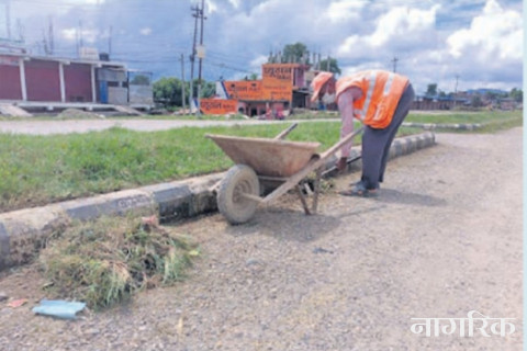 वीरेन्द्रनगर–१० पिपिराका ३४ वर्षीय बलबहादुर खत्रीले वीरेन्द्रनगरको चार लेन सडक सफाइ गर्दै आएका छन् । उनको मुखमा पुरानो माक्स छ । हातमा पन्जा छैन । सडक छेउ तथा नालामा गुट्का खाएर यत्रतत्र फालिएका फोहोर र माक्स छन् ।
