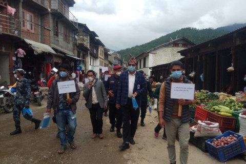 जुम्लाका प्रमुख जिल्ला अधिकारी भुपेन्द्र थापा बिहीबार खलंगा बजारमा मास्क बाड्न निस्किए । उनले हरेक घरदैलोमा पुगेर मास्क दिए । मास्कको अनिवार्य प्रयोग गर्न सुझाव दिए ।
