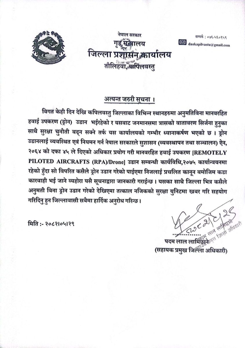 केही दिनयता जिल्लाको सिमावर्ती क्षेत्रमा रातको समयमा अनाधिकृत ड्रोन उडाएको पाइएपछि कपिलवस्तु प्रशासनले तत्काल रोक्न आग्रह गरेको छ । जनमानसमा त्रास फैलिएको भन्दै गैर कानुनीरुपमा ड्रोन उडाइएको पाइए काड कारबाही गर्ने उसको चेतावनी दिएको हो ।
