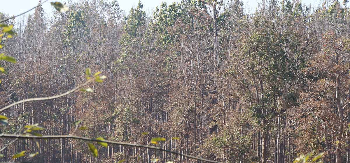 दाङको तुलसीपुर उपमहानगरपालिका–३ स्थित नमूना महिला सामुदायिक वनमा सालका रूखहरू सुकेका जस्ता देखिन्छन्। पालुवा पलाउने बेलामा सालका रूखहरू डढेला लागेका जस्ता देखिने गरेका छन्। दुई सय ६० हेक्टर क्षेत्रफलमा फैलिएको उक्त सामुदायिक वनका करिब १० प्रतिशत सालहरू पातबिनाका छन्।