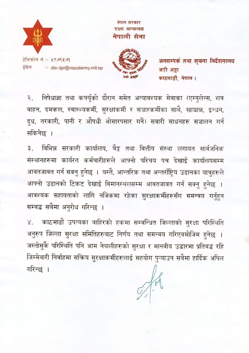 त्यसैगरी सरकारी कार्यालय, बैंक र वित्तीय संस्थासहितका सार्वजनिक संस्थानमा कार्यरत कर्मचारीले परिचयपत्र देखाएर आवतजावत गर्न सक्नेछन्। आन्तरिक तथा अन्तर्राष्ट्रिय उडानका यात्रुहरूले आफ्नो टिकट देखाएर विमानस्थलसम्म जाने सुविधा पाउने छन्।