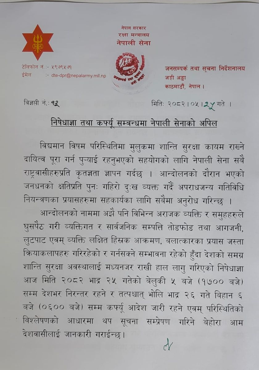 नेपाल आर्मीले निषेधाज्ञा जारी गरेर सुरक्षा जिम्मा लिएपछि अत्यावश्यक बाहेकका सवारी नचलाउन आग्रह गरेको छ ।