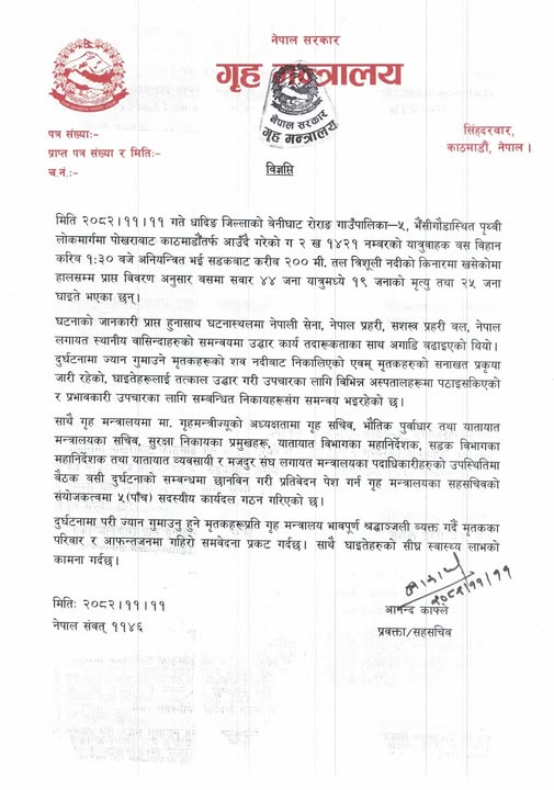 पोखराबाट काठमाडौंतर्फ आउँदै गरेको ग २ ख १४२१ नम्बरको यात्रुवाहक बस आज बिहान दुर्घटना हुदाँ १९ जनाको मृत्यु भएपछि गृह मन्त्रालयले पाँच सदस्यीय कार्यदल गठन गरेको छ।