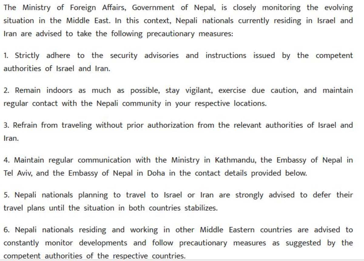 सरकारले मध्यपूर्व क्षेत्रमा विकसित हुँदै गएको अवस्थालाई नजिकबाट अनुगमन गरिरहेको भन्दै हाल इजरायल र इरानमा बसोबास गरिरहेका नेपाली नागरिकहरूलाई सावधानीका उपायहरू अपनाउन अनुरोधसमेत गरेको छ।
