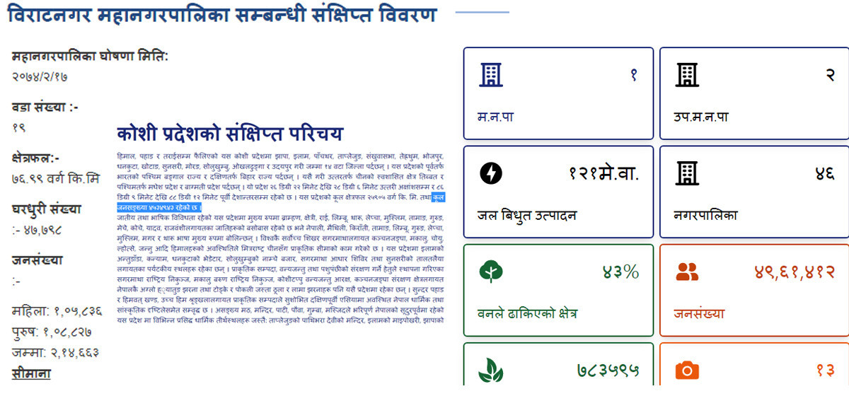 कोशी प्रदेश सरकारको आधिकारिक पोर्टलमा  कोशी प्रदेशको कुल जनसंख्या कतै ४५ लाख ३४ हजार ९ सय ४३ लेखिएको छ भने त्यही पोर्टलमा कतै ४९ लाख ६१ हजार ४ सय १२ लेखिएको पाइएको छ । कोशी प्रदेश सरकारको पोर्टलमा मात्रै हैन विराटनगर महानगरपालिकाको आधिकारिक वेबसाइटमा पनि जनसंख्या सम्बन्धी तथ्याङ्क सही नराखेको पाइएको छ ।