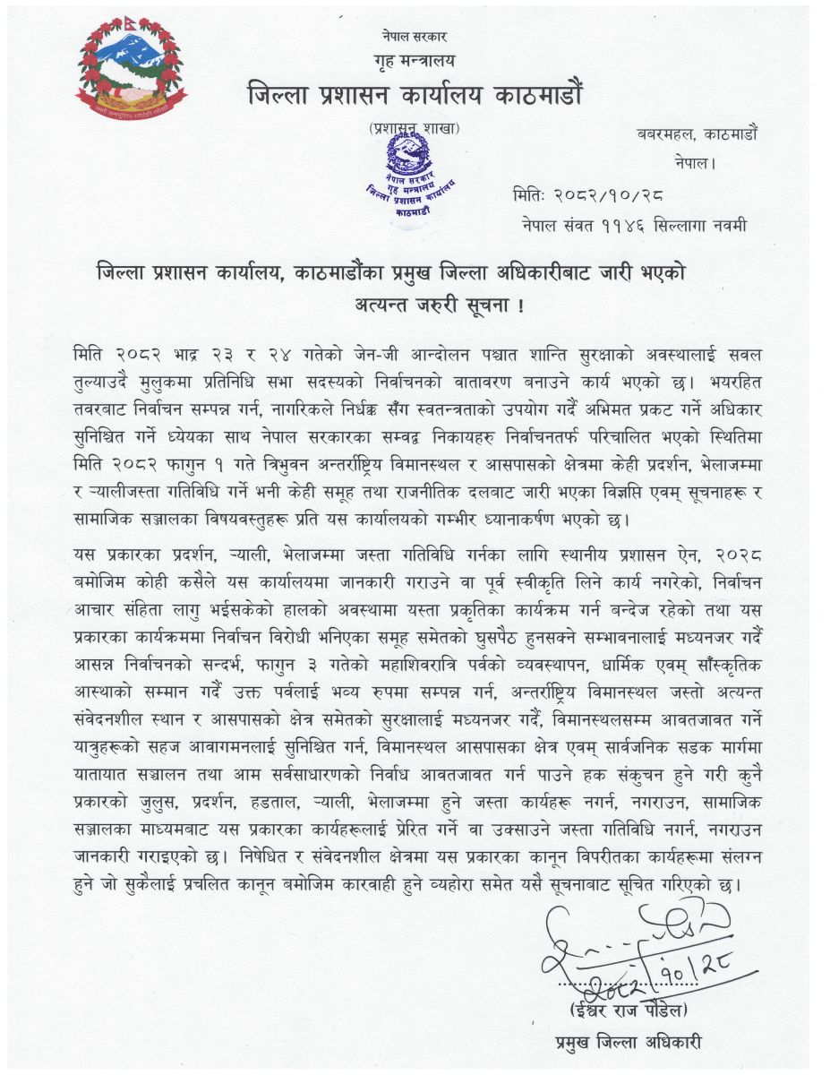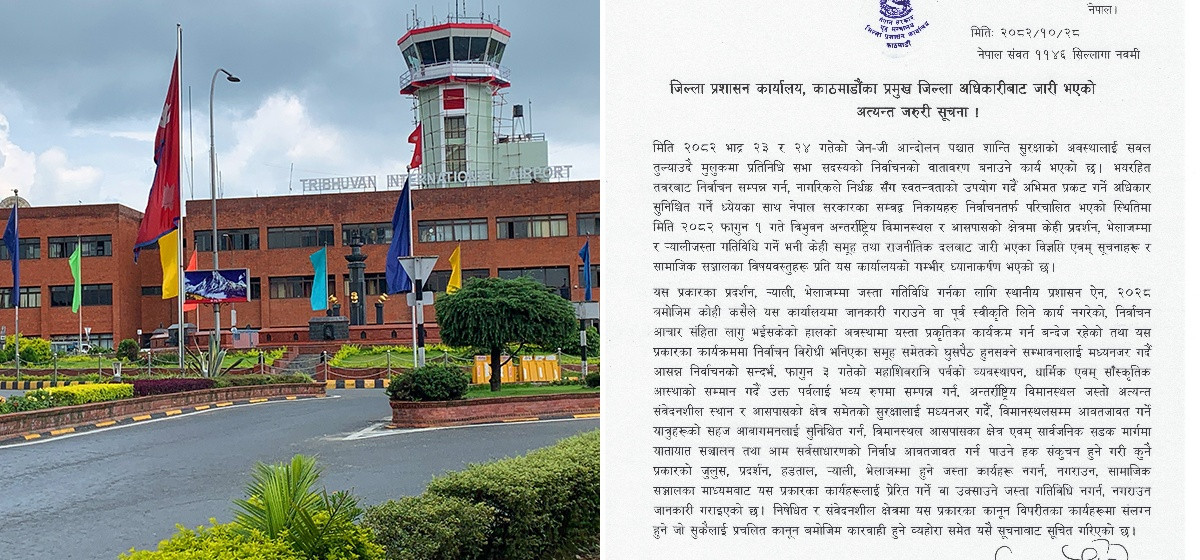 जिल्ला प्रशासन कार्यालय काठमाडौंले त्रिभुवन अन्तर्राष्ट्रिय विमानस्थल र आसपास क्षेत्रमा जुलुस, प्रदर्शन, र्याली, भेला, हड्तालजस्ता सबै गतिविधि निषेध गरेको छ।
