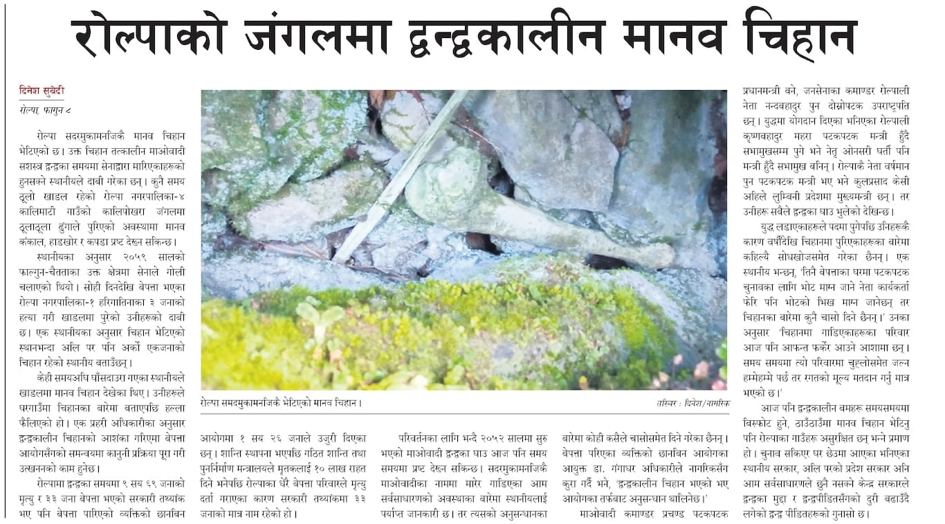 नागरिक दैनिकले २०७८ फाल्गुन ९ गतेको अंकमा ‘रोल्पाको जंगलमा द्वन्द्वकालीन मानव चिहान’ भन्ने शीर्षकमा समाचार प्रकाशित गरेको थियो। समाचार प्रकाशित भएपछि जिल्ला प्रहरी कार्यालय रोल्पाले चिहान उत्खनन गरेर अस्थिपञ्जर परीक्षणका लागि विधि विज्ञान प्रयोगशाला पठाएको थियो। नतिजा अहिलेसम्म सार्वजनिक छैन।
