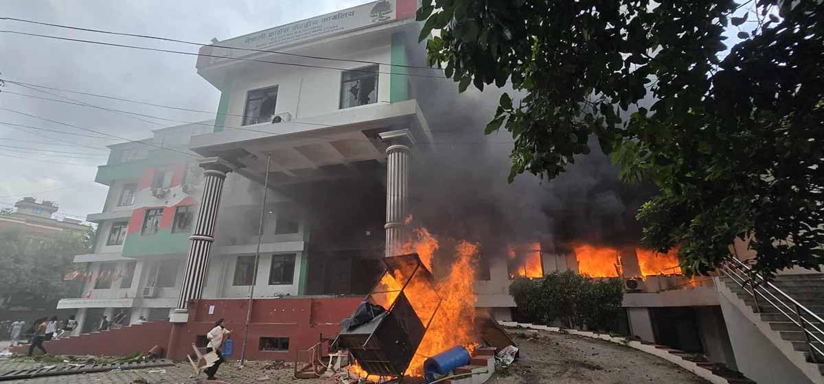 आन्दोलनकारी युवाले सानेपास्थित नेपाली कांग्रेसको केन्द्रीय कार्यालयमा तोडफोड र आगजनी गरेका छन्।