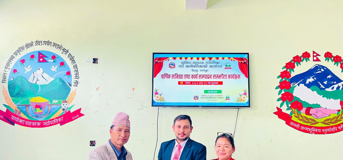 कार्य सम्पादन सम्झौताअनुसारको प्रगति गाउँपालिकाले प्रमुख प्रशासकीय अधिकृतसँग र प्रमुख प्रशासकीय अधिकृतले विषयगत शाखाका प्रमुखसँग नियमित रूपमा लिने सहमति भएको पालिका अध्यक्ष मेन्याङ्वोले जानकारी दिए। पालिका उपाध्यक्ष रनमाया गुरुङको उपस्थितिमा पालिका अध्यक्ष मेन्याङ्वोसँग कार्य सम्पादन सम्झौता गरेका प्रमुख प्रशासकीय अधिकृत पौडेलले विषयगत शाखाका प्रमुखसँग कार्य सम्पादन सम्झौता गरेका छन्। विषयगत शाखाबाट प्रवाह हुने सेवालाई सहज, सरल, पारदर्शी, जनमैत्री, मितव्ययी बनाउने जस्ता विषयमा केन्द्रित गरेर प्रमुख प्रशासकीय अधिकृत र विषयगत शाखाका प्रमुखबिच कार्य सम्पादन सम्झौता भएको छ।