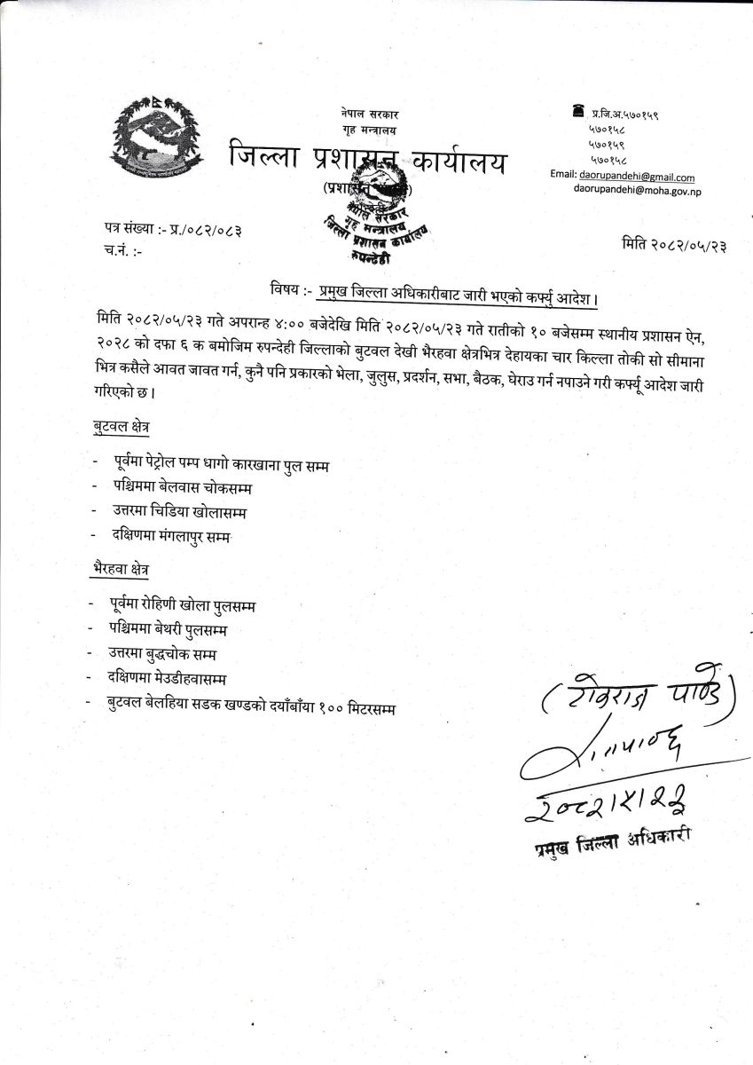 जिल्ला प्रशासन कार्यालय रूपन्देहीले सोमबार दिउँसो ४ बजेदेखि राति १० बजेसम्मलाई कर्फ्यू आदेश जारी गरेको हो।