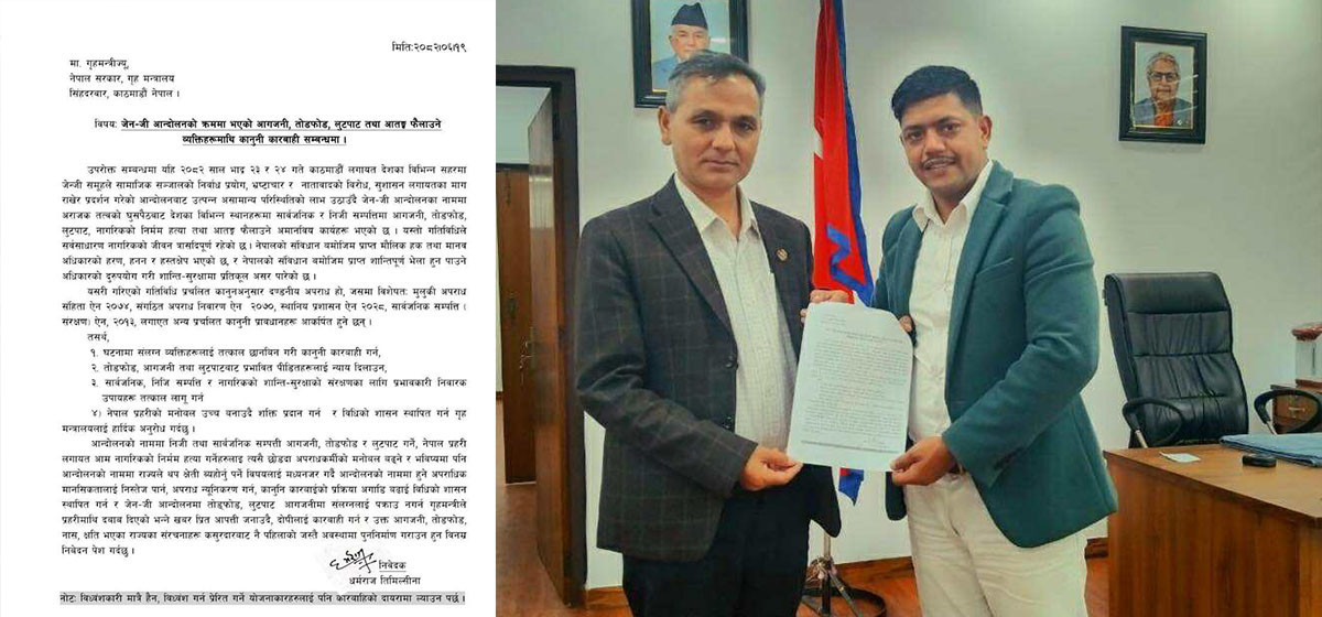 सरकारले जेनजी आन्दोलनका क्रममा आगजनी, तोडफोड, लुटपाट तथा आतङ्क फैलाउनेमाथि कानुनी कारबाही नगर्न प्रहरीलाई दबाब दिएपछि धर्मराज तिमिल्सिनाले यस्तो माग गरेका हुन्। उनले आइतबार गृहमन्त्री ओमप्रकाश अर्याललाई निवेदन दिएर कानुनी कारबाहीका लागि आग्रह गरेका थिए।