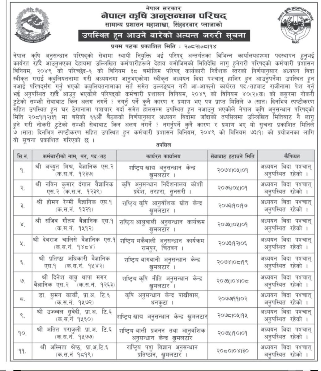 नेपाल कृषि अनुसन्धान परिषद (नार्क) का ६ जना वैज्ञानिकसहित ११ कर्मचारी सम्पर्कविहीन भएका छन्।