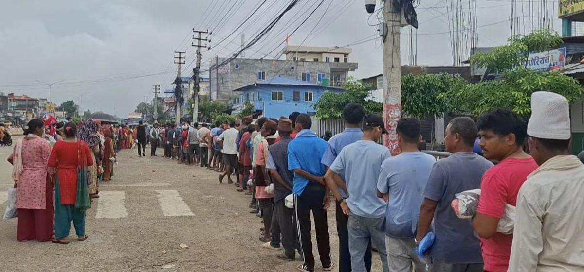 बाँकेको कोहलपुरमा आइतबार बिहान रासायनिक मल लिन पुगेका किसानहरू। तस्बिर: दिपेन्द्र शाही