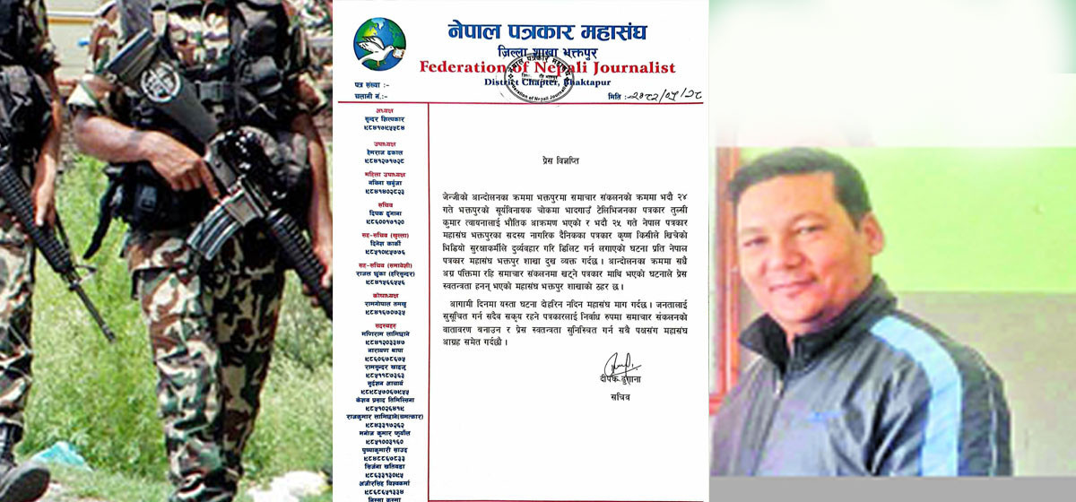 महासंघका जिल्ला सचिव दीपक ढुंगानाद्वारा जारी गरिएको प्रेस विज्ञप्तिमा, समाचार संकलनको क्रममा नेपाली सेनाबाट पत्रकार किसीमाथि दुर्व्यवहार भएको उल्लेख छ।