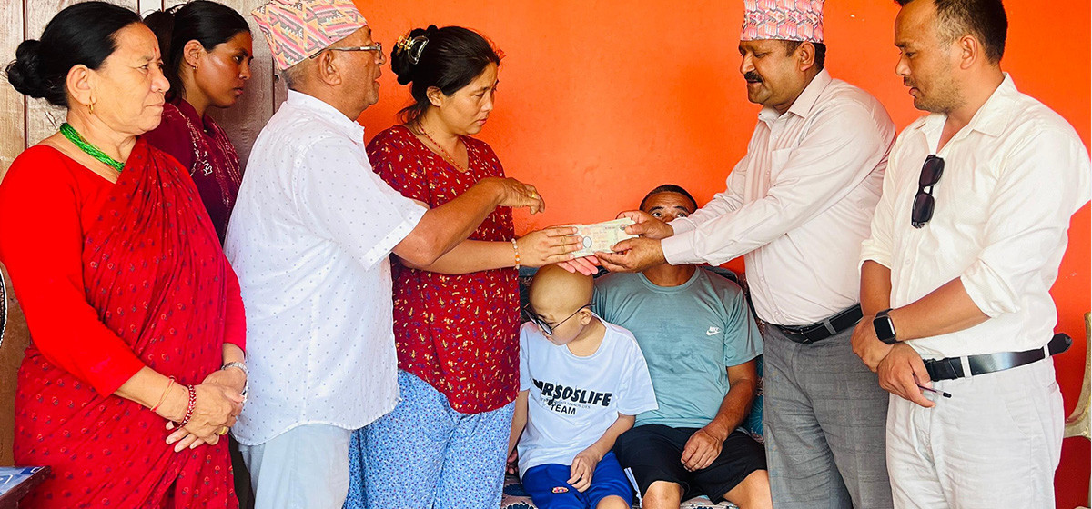 क्यान्सर पीडित बालकका आमालाई सहयोग रकम हस्तान्तरण गर्दै अध्यक्ष विश्वकर्मा र अभियन्ता लो। तस्बिरः महेश्वर
