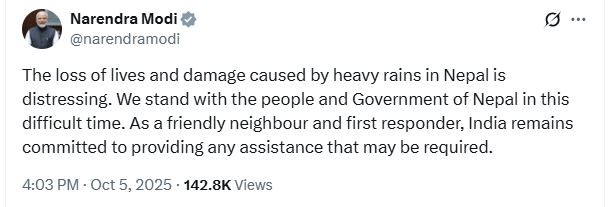 उनले लेखेका छन्, 'नेपालमा भारी वर्षाका कारण भएको जनधनको क्षति पीडादायी छ। हामी यस कठिन समयमा नेपाली जनता र नेपाल सरकारको साथमा छौं। एक मित्रवत् छिमेकी र पहिलो रेस्पोन्डरको रूपमा भारत आवश्यक पर्ने कुनै पनि प्रकारको सहयोग गर्न प्रतिबद्ध छ।'