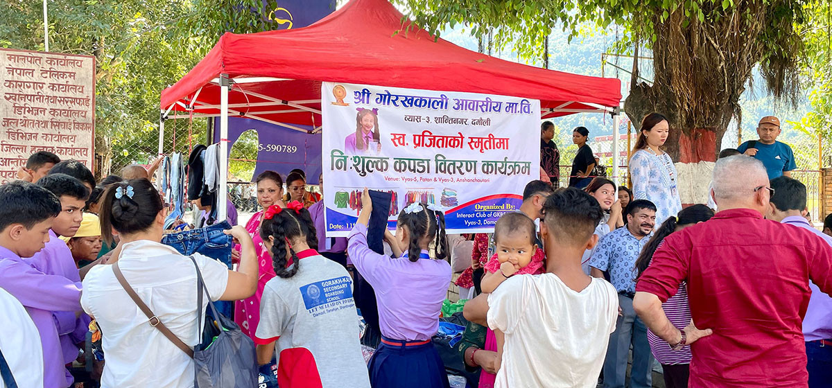 तनहुँको व्यास नगरपालिका-३ शान्तिनगरस्थित गोरखकाली आवासीय माध्यमिक विद्यालयका विद्यार्थीले खाजा खर्च बचाएर जम्मा गरेको रकमबाट ३०० जना सर्वसाधारणलाई निःशुल्क कपडा वितरण गरेका छन्।