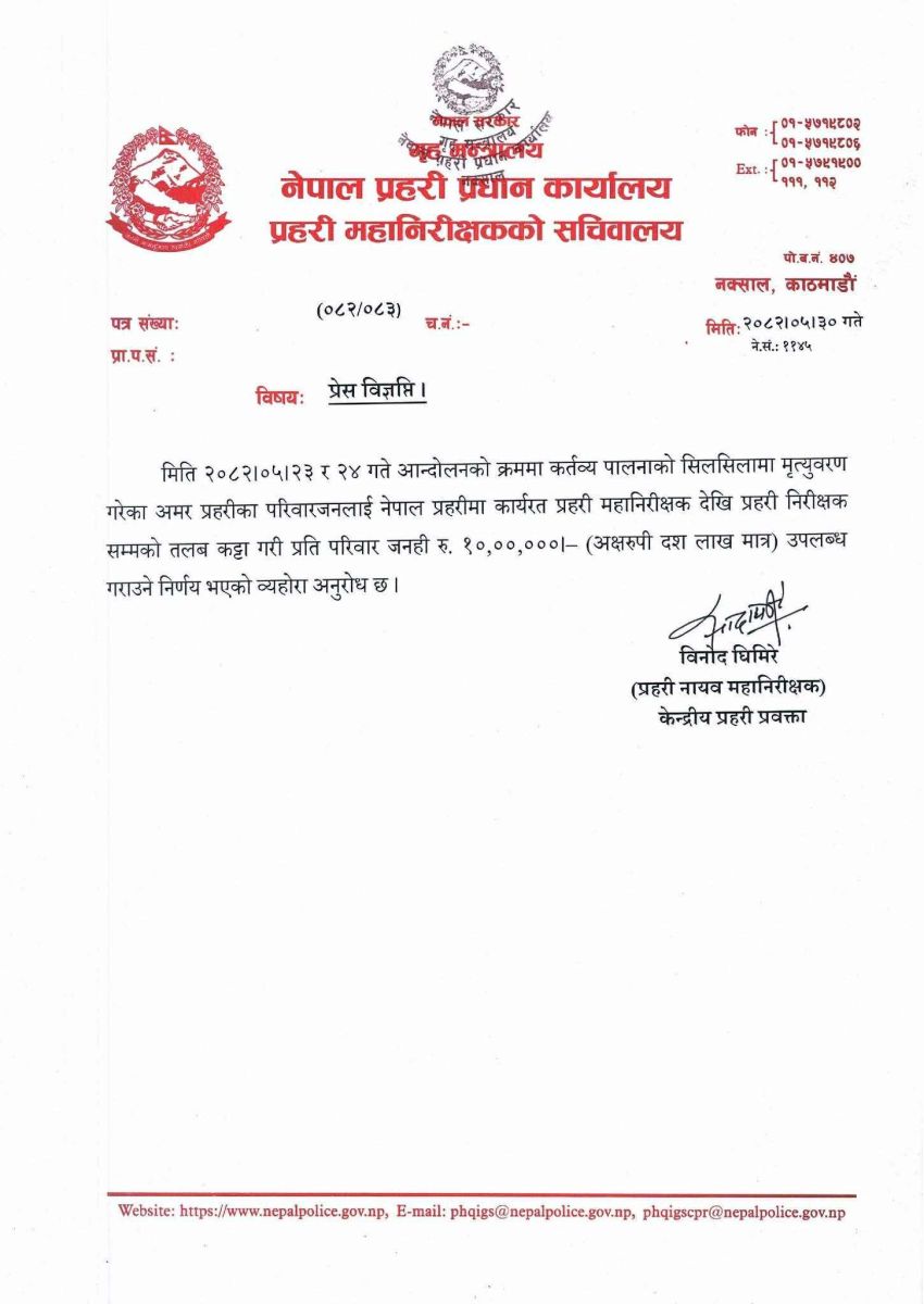 जेन जी युवाहरूले गत सोमबार र मंगलबार काठमाडौंसहित देशैभर गरेको आन्दोलनका क्रममा मृत्यु हुने प्रहरीका परिवारले दश लाख रुपैयाँ राहत पाउने भएका छन् ।