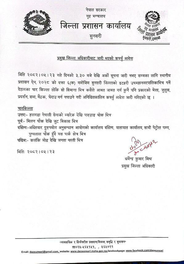 प्रमुख जिल्ला अधिकारी धर्मेन्द्र प्रसाद मिश्रले एक सूचना जारी गर्दै इटहरी उपमहानगरको चारकिल्ला तोकेर अनिश्चितकालिन कर्फ्यू आदेश जारी गरेका हुन् ।