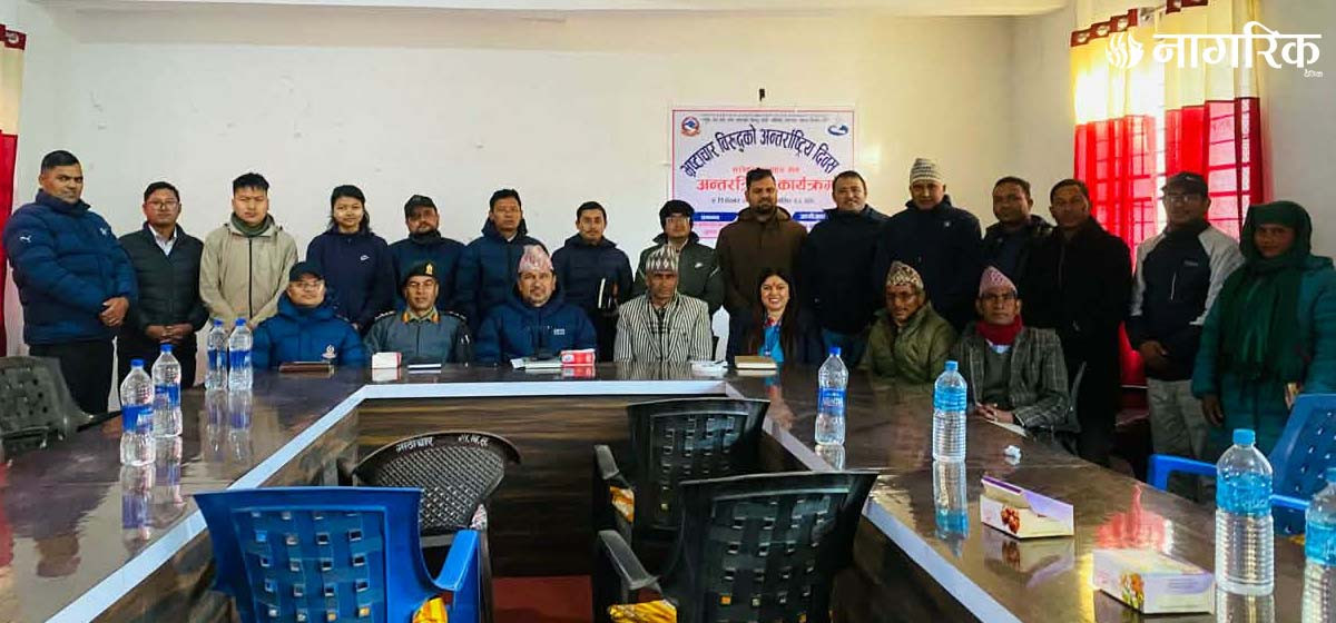 ‘युवाको एकता, सुशासनको आधार’ भन्ने मूल नाराका साथ मंगलबार जुम्लामा अन्तर्राष्ट्रिय भ्रष्टाचार विरुद्धको दिवस एक विशेष अन्तरक्रिया कार्यक्रमका बीच सम्पन्न भएको छ।