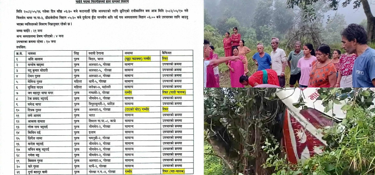 १. चालक झक बहादुर थापा मगर (३८), गोरखा, गण्डकी गाउँपालिका–२ - कमरमा चोट, अवस्था मध्यम, काठमाडौं रिफर।