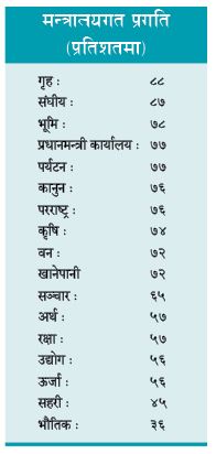 सकारको नीति तथा कार्यक्रम र बजेट कार्यान्वयनको माइलस्टोन (लक्ष्य) हासिलमा गृह मन्त्रालय पहिलो नम्बरमा परेको प्रधानमन्त्री तथा मन्त्रिपरिषद् कार्यालय स्रोतको भनाइ छ। प्रधानमन्त्री कार्यालय स्रोतका अनुसार गृहले तोकिएका १०६ लक्ष्यमध्ये ९३ वटा पूरा गरेको छ भने १३ वटा लक्ष्यमा काम जारी छ। स्रोतका अनुसार शासकीय सुधारका क्षेत्रमा गृहले ८८ प्रतिशत प्रगति पूरा गरेको छ।