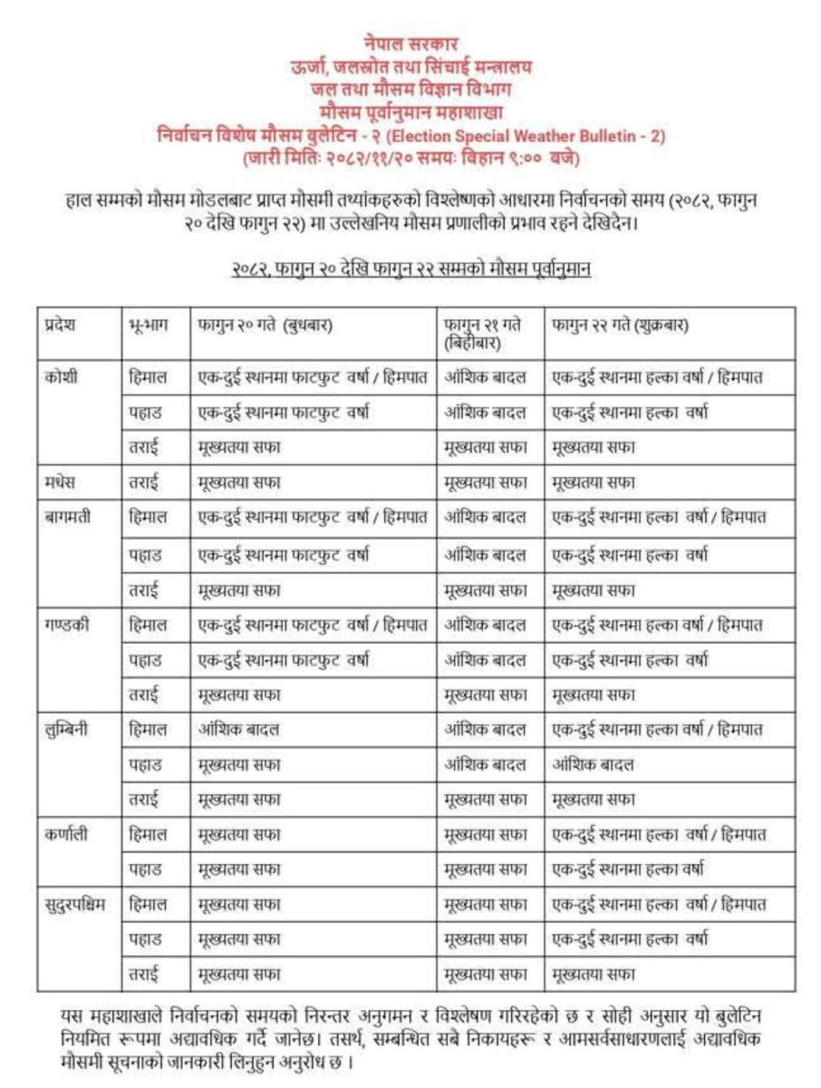 प्रतिनिधिसभा सदस्य निर्वाचनको दिन कतै पनि पानी पर्ने सम्भावना नरहेको मौसमविद्ले बताएका छन्।