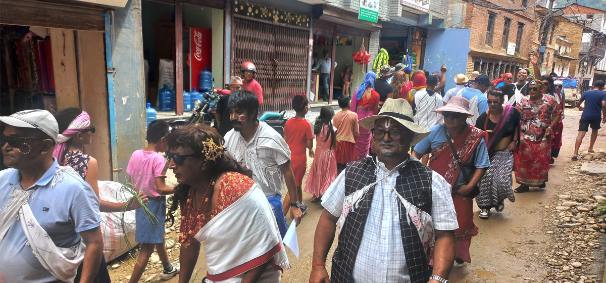 चोली र फरिया लगाएर महिला भेषमा सजिएका दुई दर्जन बढी पुरुषहरू छन् । उनीहरूको हातमा धानको बीउ जस्तो देखिने घाँस छन् । परबाट झट्ट हेर्दा शृङ्गारले सजिएका उनीहरु पुरुष नै हुन् भनेर छुट्याउन कठिन हुन्छ ।उनीहरु मुखियाको खेत रोप्न आएका रोपारहरूको रुपमातयार छन् ।उनीहरूसँगै केही पुरुष पहिरनमा गाढा र भाङ्ग्रालगाएकाहरु हातमाकुतो कोदालो समातेका छन् । उनीहरूको काम खेत हिल्याउने र आली लगाउने हो । उनीहरु बाउँसेको भूमिकामा छन् ।