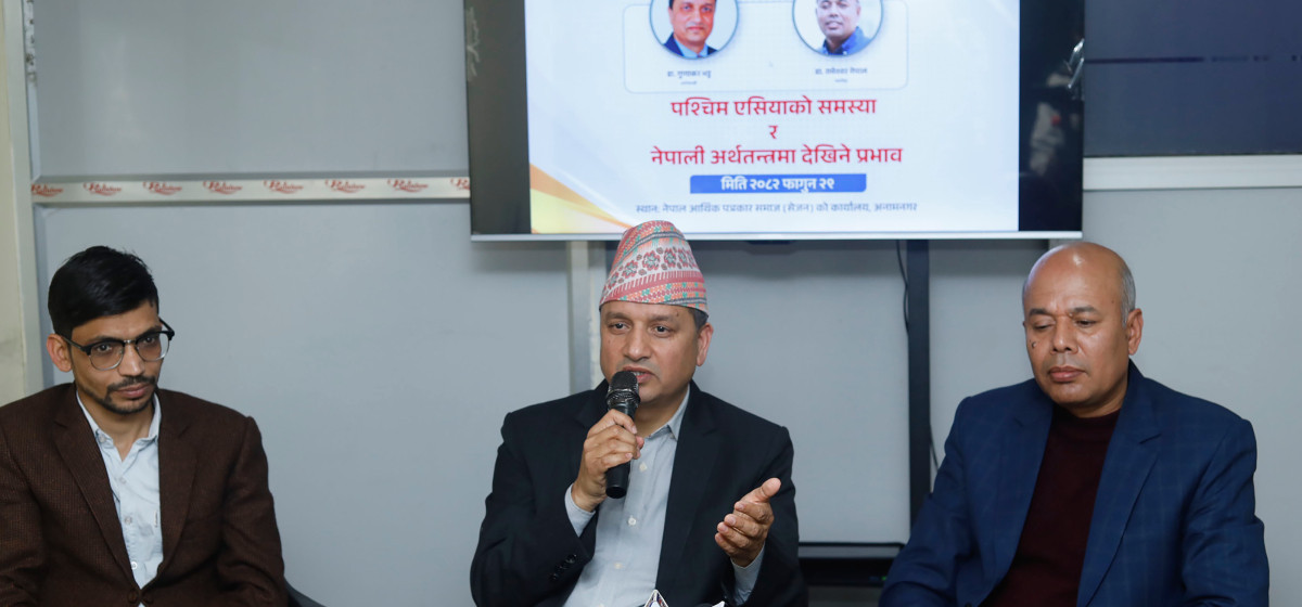 नेपाल आर्थिक पत्रकार समाज (सेजन)ले शुक्रबार आयोजना गरेको ‘पश्चिम एसियाको समस्या र नेपाली अर्थतन्त्रमा देखिने प्रभाव’ विषयक अन्तरक्रियामा अर्थ-आप्रावसन क्षेत्रका जानकारहरुले उक्त सङ्कटबाट जोगिन जतिसक्दो चाँडो पूर्वतयारीका काम अघि बढाउन सरकारको ध्यानाकर्षण गराए।