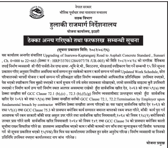 सडक विभाग मातहतको हुलाकी राजमार्ग निर्देशनालयअन्तर्गत योजना कार्यालय इटहरीले मंगलबार सडक निर्माणका लागि गौरीपार्वती-देव एण्ड सायर-भूमि संयुक्त उपक्रम (जेभी), विराटनगरसँगको ठेक्का सम्झौता अन्त्य गरिएको सार्वजनिक सूचना जारी गरेको छ ।