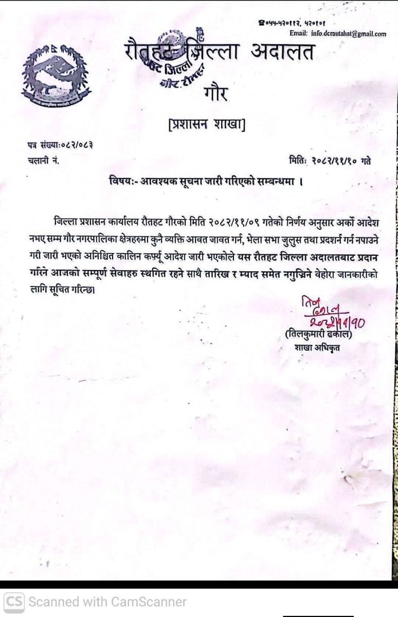 जिल्ला प्रशासन कार्यालय रौतहटले सदरमुकाम गौरमा अनिश्चितकालीन कर्फ्यू आदेश जारी गरेसँगै रौतहट जिल्ला अदालतले आफ्ना सम्पूर्ण सेवाहरू स्थगित गरेको छ।