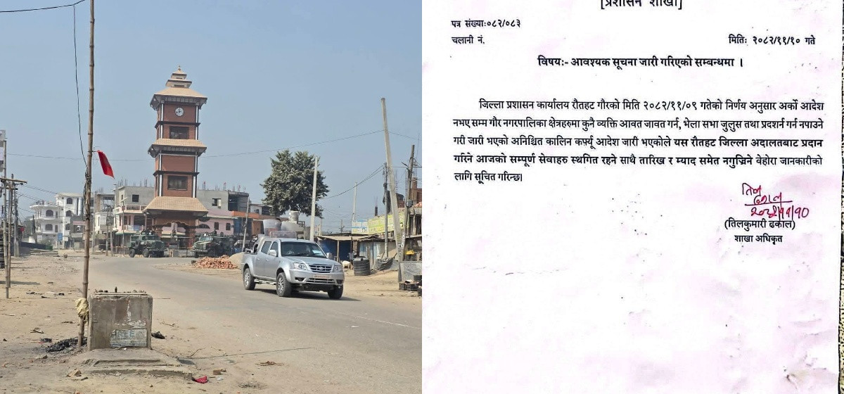 जिल्ला प्रशासन कार्यालयको शनिबारको निर्णयअनुसार अर्को आदेश नभएसम्मका लागि गौर नगरपालिका क्षेत्रभित्र हिँडडुल गर्न, भेला हुन, सभा-जुलुस तथा प्रदर्शन गर्न रोक लगाउँदै कर्फ्यू आदेश जारी गरिएको हो।