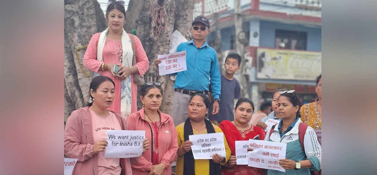 केही दिनअघि कर्णाली प्रदेशको सुर्खेत वीरेन्द्रनगरकी किशोरी इनिशा बिश्वकर्माको सामूहिक बलात्कारपछि हत्या भएको घटनाप्रति यहाँका डेढ दर्जन सामाजिक अधिकारकर्मी संघसंस्थाले विरोध प्रदर्शन गरेका छन्। जिल्लामा क्रियाशील संघसंस्थाहरूले एक विज्ञप्ति प्रकाशित गर्दै घटनाप्रति खेद व्यक्त गरेका छन्। साथै, उनीहरूले दोषी उपर कडा कारबाही र आगामी दिनमा यस्ता घटना हुन नदिन सरोकारवाला पक्षलाई सचेत समेत गराएका छन्।