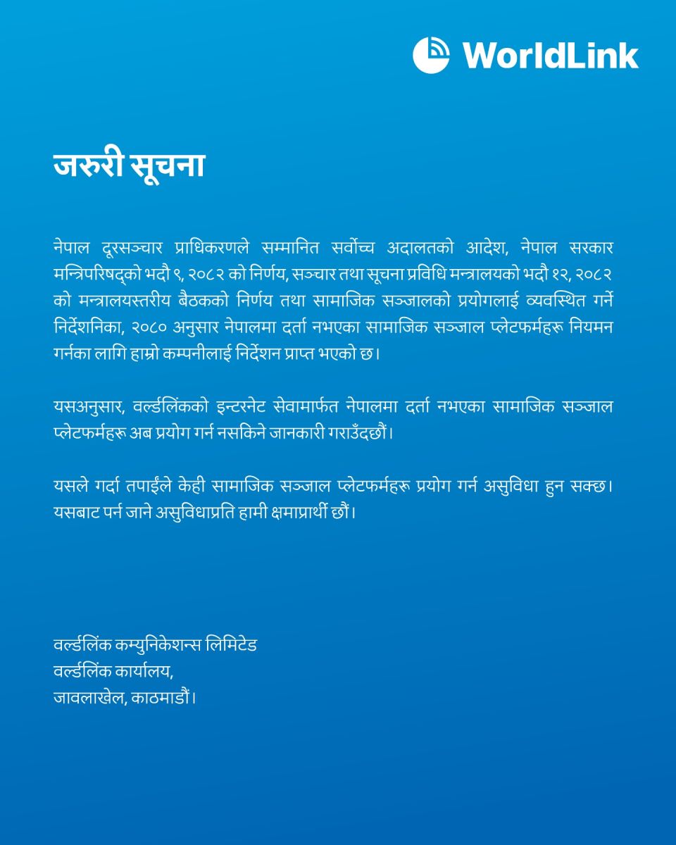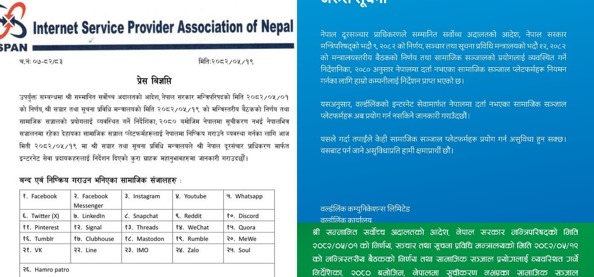 नेपाल दूरसञ्चार प्राधिकरणको निर्देशन र सर्वोच्च अदालतको आदेश बमोजिम सञ्चार तथा सूचना प्रविधि मन्त्रालय र मन्त्रिपरिषद्को निर्णयअनुसार यी प्लेटफर्महरू निष्क्रिय गरिएको हो। यस निर्णयले फेसबुक, इन्स्टाग्राम, युट्युब, ह्वाट्सएप, ट्वीटर (एक्स), लिङ्क्डइन, रेडिट, स्न्यापच्याट, डिस्कर्ड, पिन्टरेस्ट, थ्रेड्स, विच्याट, क्वोरा, हाम्रो पात्रोलगायतका सामाजिक सञ्जालहरू नेपालमा प्रयोग गर्न नसकिने भएको छ।