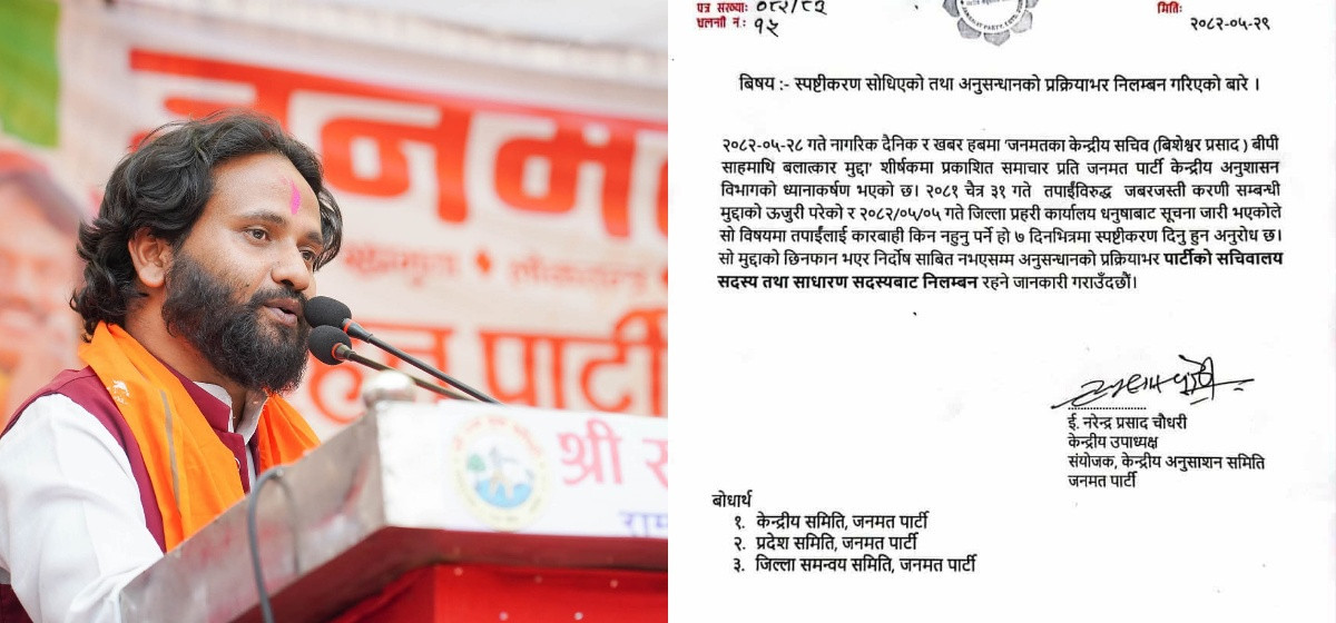 सिके राउत नेतृत्वको जनमत पार्टीका केन्द्रीय सचिव बीपी साह भनिने विश्वेश्वर प्रसाद साह निलम्बनमा परेका छन् । उनमाथि जिल्ला प्रहरी कार्यालय धनुषामा जबरजस्ती करणीको मुद्दा दायर भएपछि अनुशासन समितिले उनलाई सचिव पदबाट निलम्बन गरेको हो ।