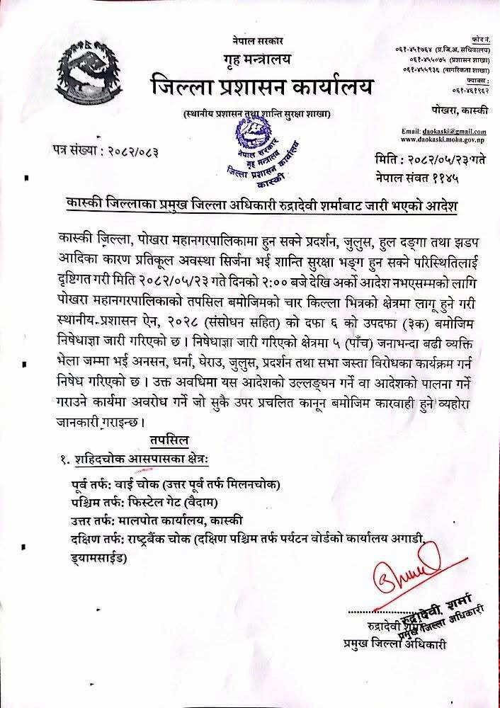 जेन-जी को आन्दोलनले उग्ररुप लिएपछि पोखरामा कर्फ्यु लगाइएको छ । कास्कीका प्रमुख जिल्ला अधिकारी रुद्रदेवी शर्माले अर्को आदेश नभएसम्मका लागि भन्दै कर्फ्यू आदेश जारी गरेकी हुन् ।