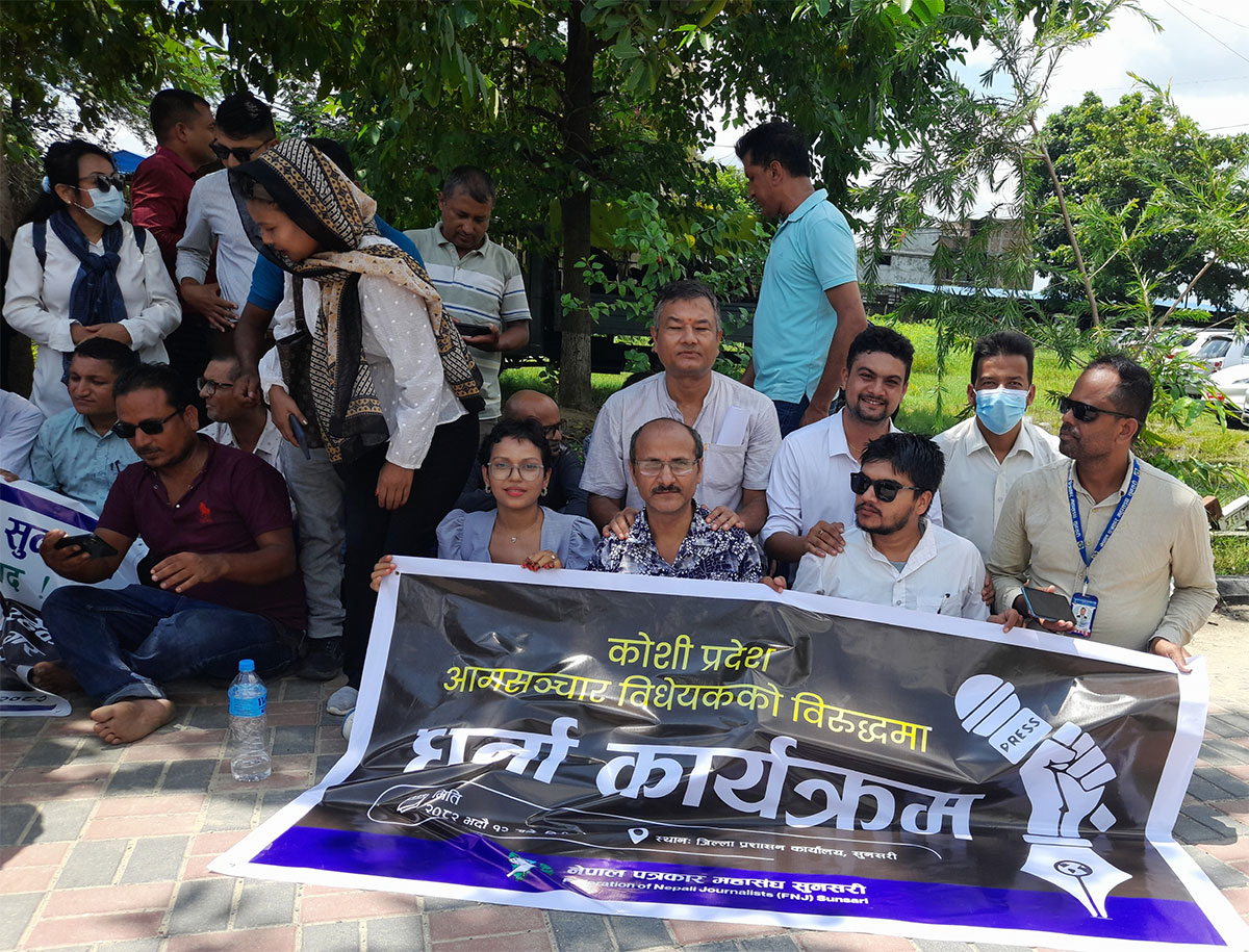 जिल्ला शाखाको अगुवाइमा जिल्ला प्रशासन कार्यालय अगाडि धर्ना दिइएको हो । यस्तै, नेपाल पत्रकार महासंघ कोशी प्रदेश समितिको अगुवाइमा कोशी प्रदेशका मुख्यमन्त्री हिक्मत कार्कीको कार्यालय अगाडि पनि धर्ना दिएको छ ।