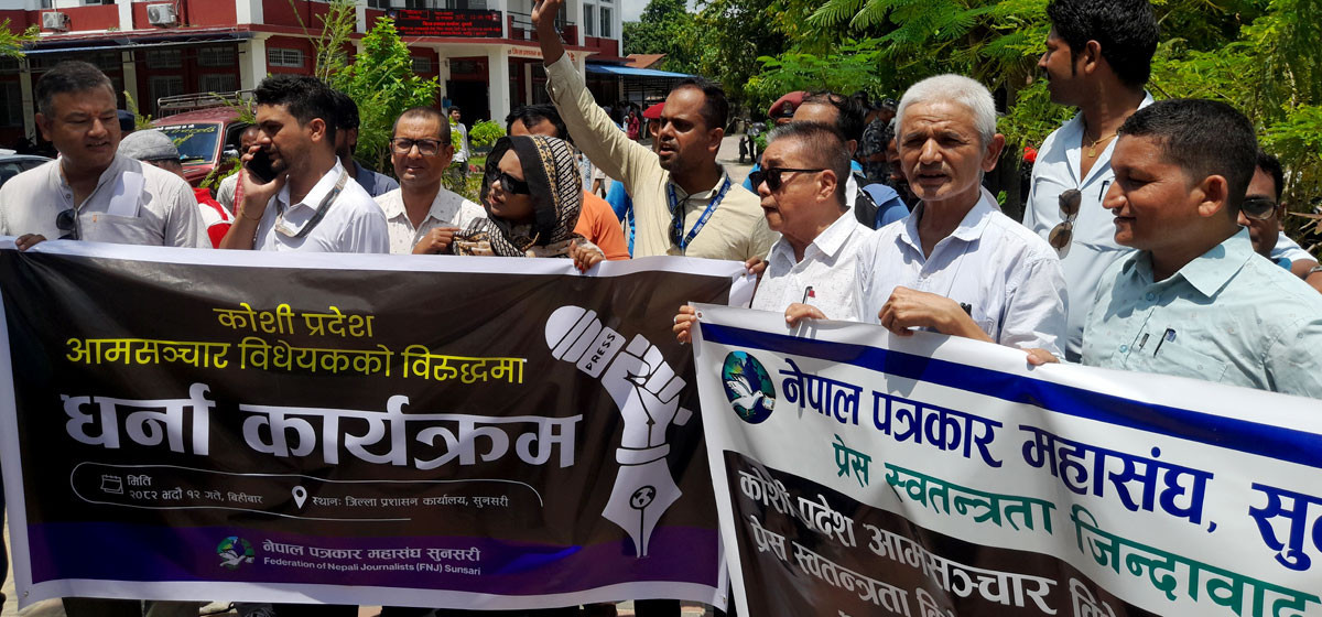 नेपाल पत्रकार महासंघ कोशी प्रदेशको अगुवाइमा प्रदेशभरका पत्रकार भदौं ९ गतेदेखि चरणबद्ध आन्दोलनमा उत्रिएका हुन् ।