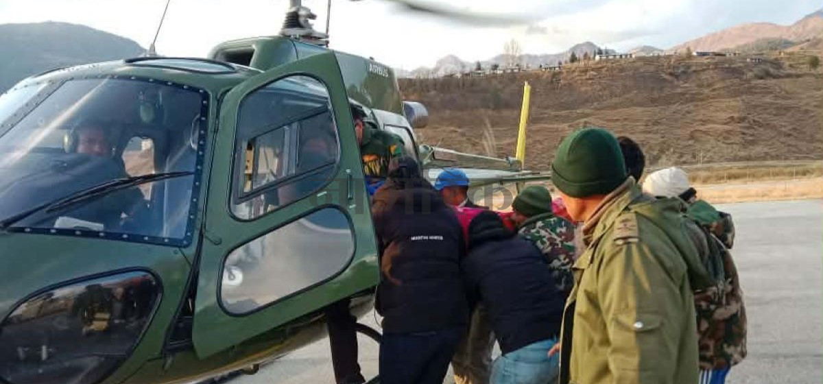 जुम्लाको तातोपानी गाउँपालिका ६ धौलापानीमा भएको सवारी दुर्घटनामा गम्भीर घाइते एक जनालाई थप उपचारका लागि हेलिकोप्टरमार्फत काठमाडौं लगिएको छ। हिमा गाउँपालिका–२ ओदी गाउँका धमेन्द्र रोकायालाई सेनाको हेलिकोप्टरमार्फत् उनलाई काठमाडौं लगिएको हो ।